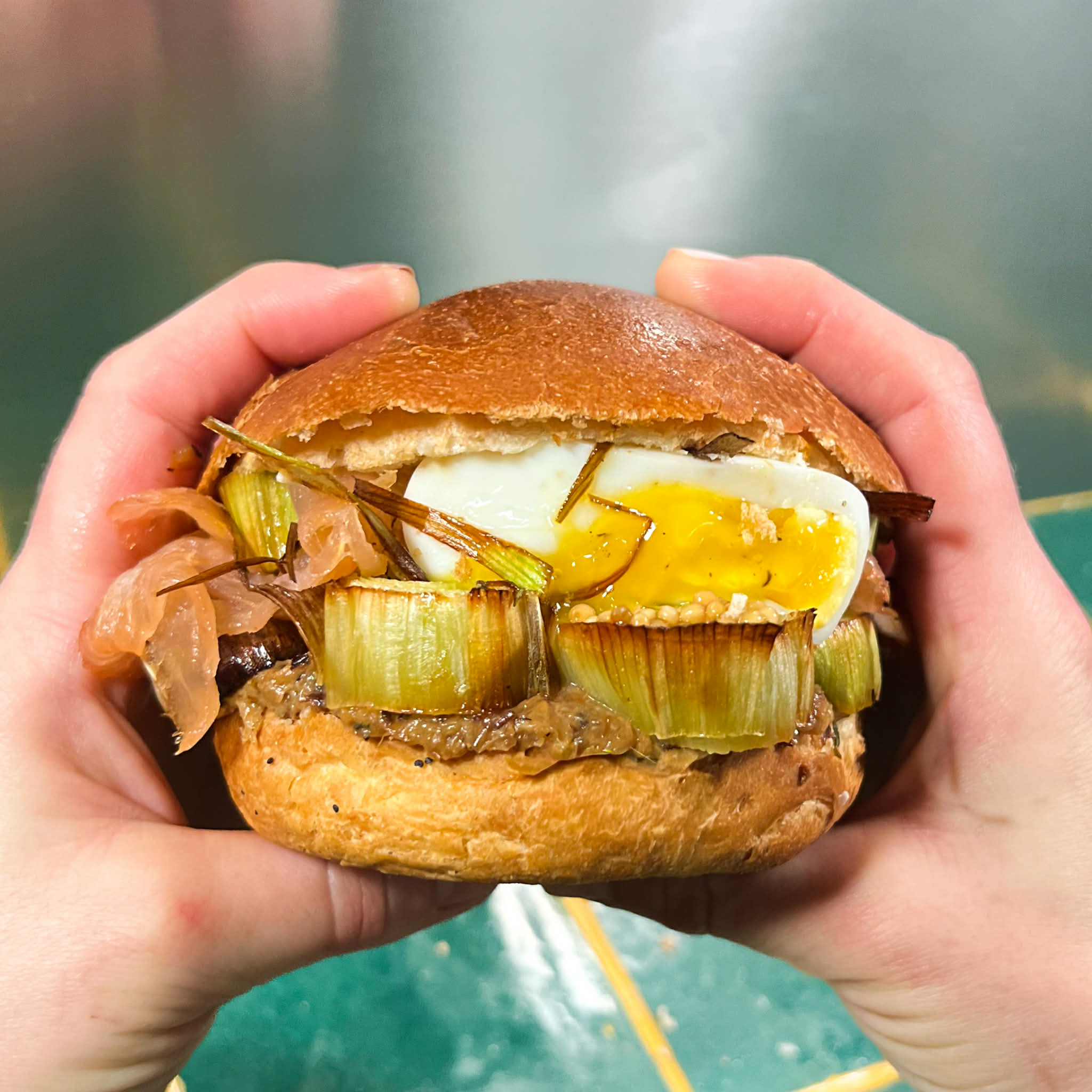 Œuf mollet, mousse de poireaux, poireaux rôtis au four, poireaux frits, pickles de moutarde – sauce : mousse de beurre citronné et truffé